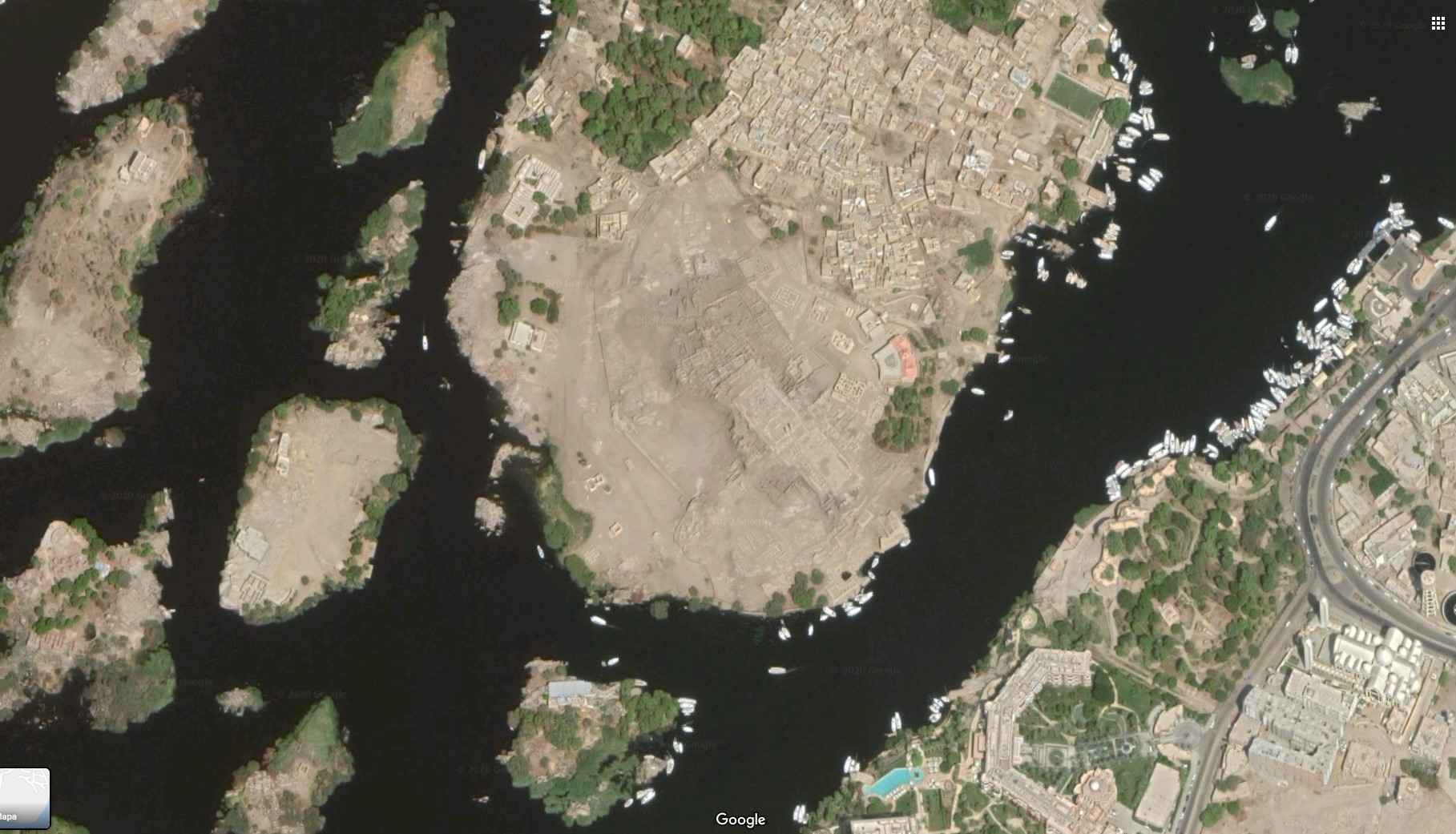 Elephantine measures 1,200 meters (3,900 feet) from north to south and 400 meters (1,300 feet) wide at its widest point. The layout of this and other nearby islands in Aswan can be seen from the slopes of the west bank along the Nile. The island is located downstream of the First Cataract, on the southern border of Upper Egypt with Lower Nubia. This upper region is known as Upper Egypt because it is higher up the Nile.