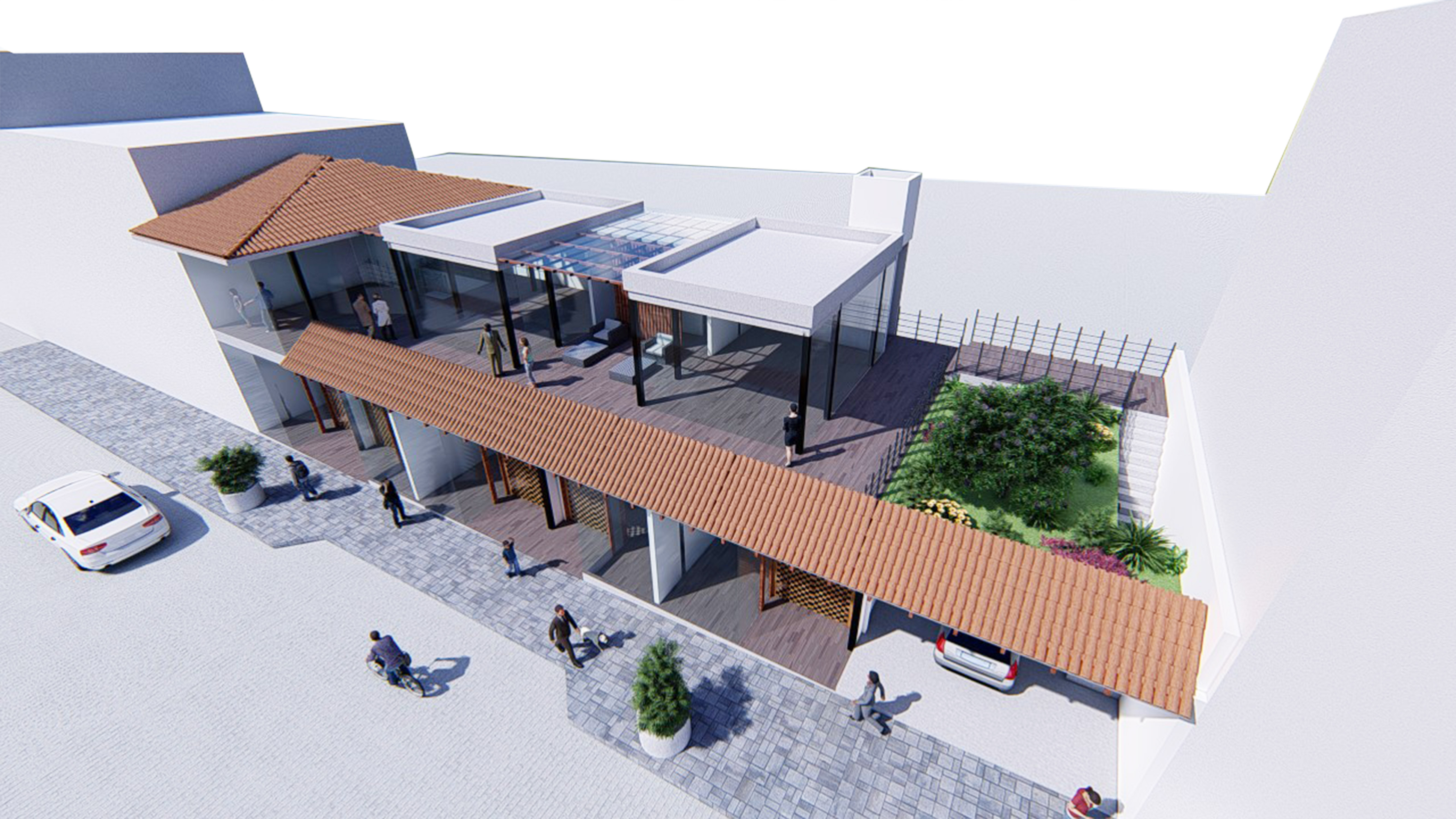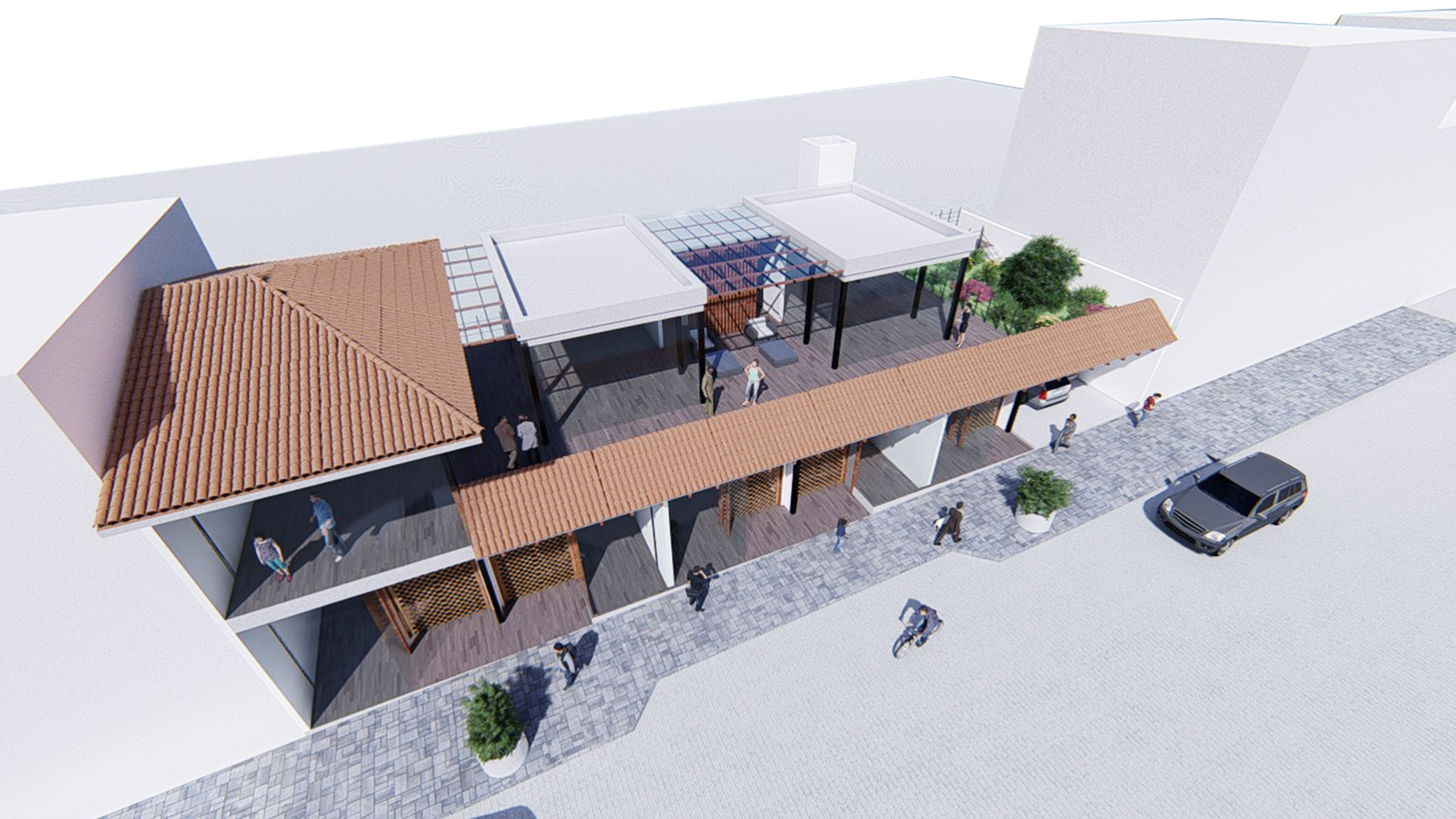 Its upper floor designed for the operation of a cafeteria/restaurant consists of a terrace space that provides a direct view of the activities on the street.