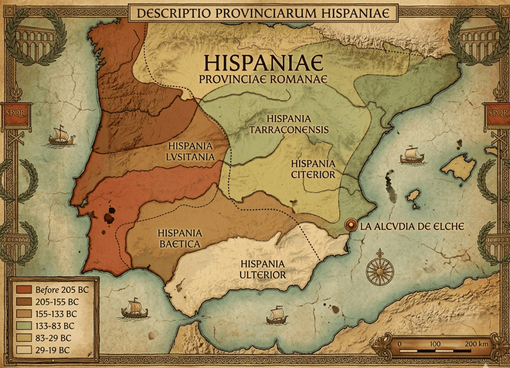 The Roman colony of Ilici was established during Augustus’s reign around 26 BC after the reorganization of Hispania post-civil wars.